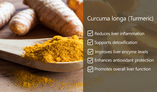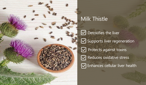Milk Thistle detoxifies and repairs liver cells, while Turmeric reduces inflammation and boosts enzyme activity.